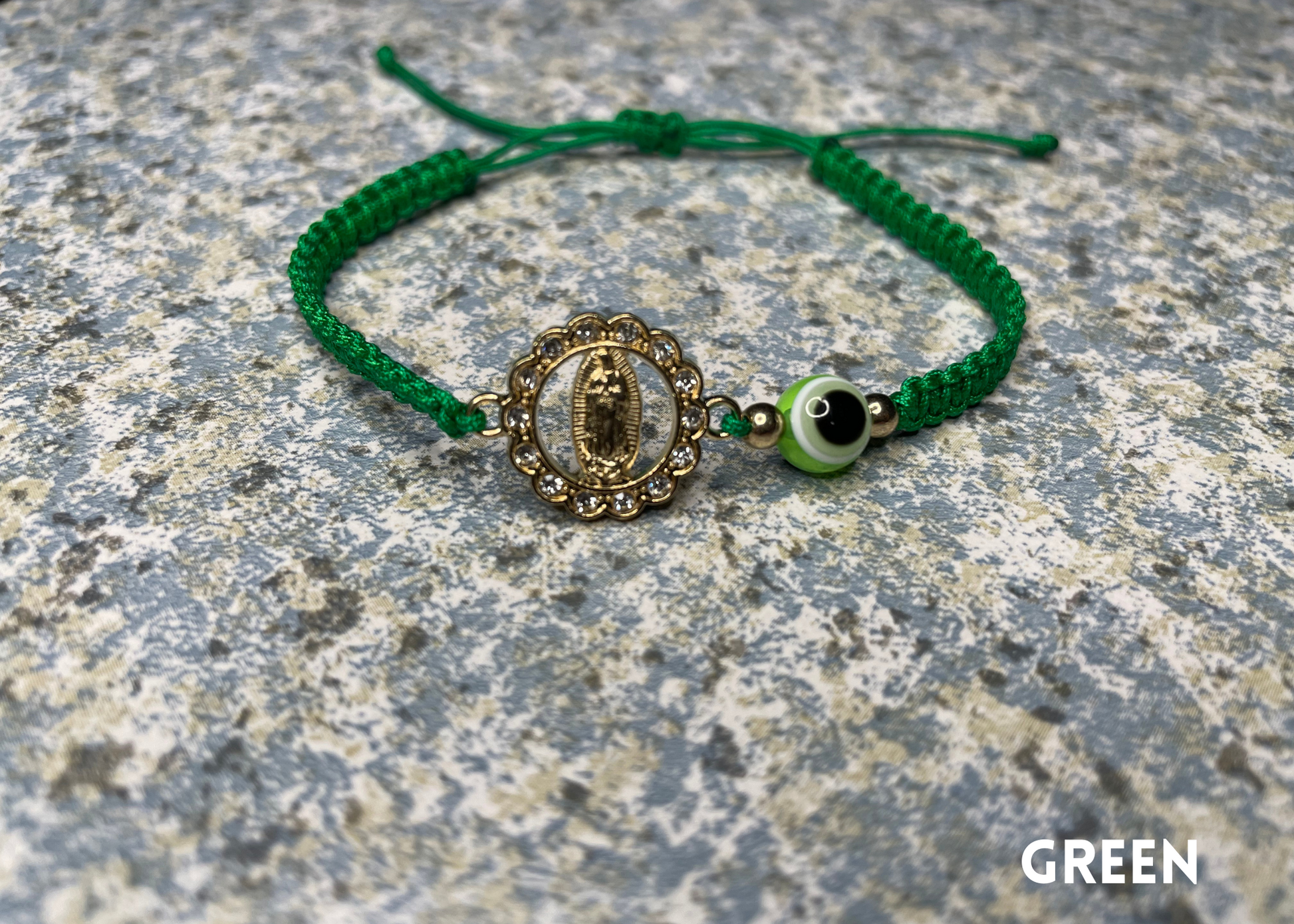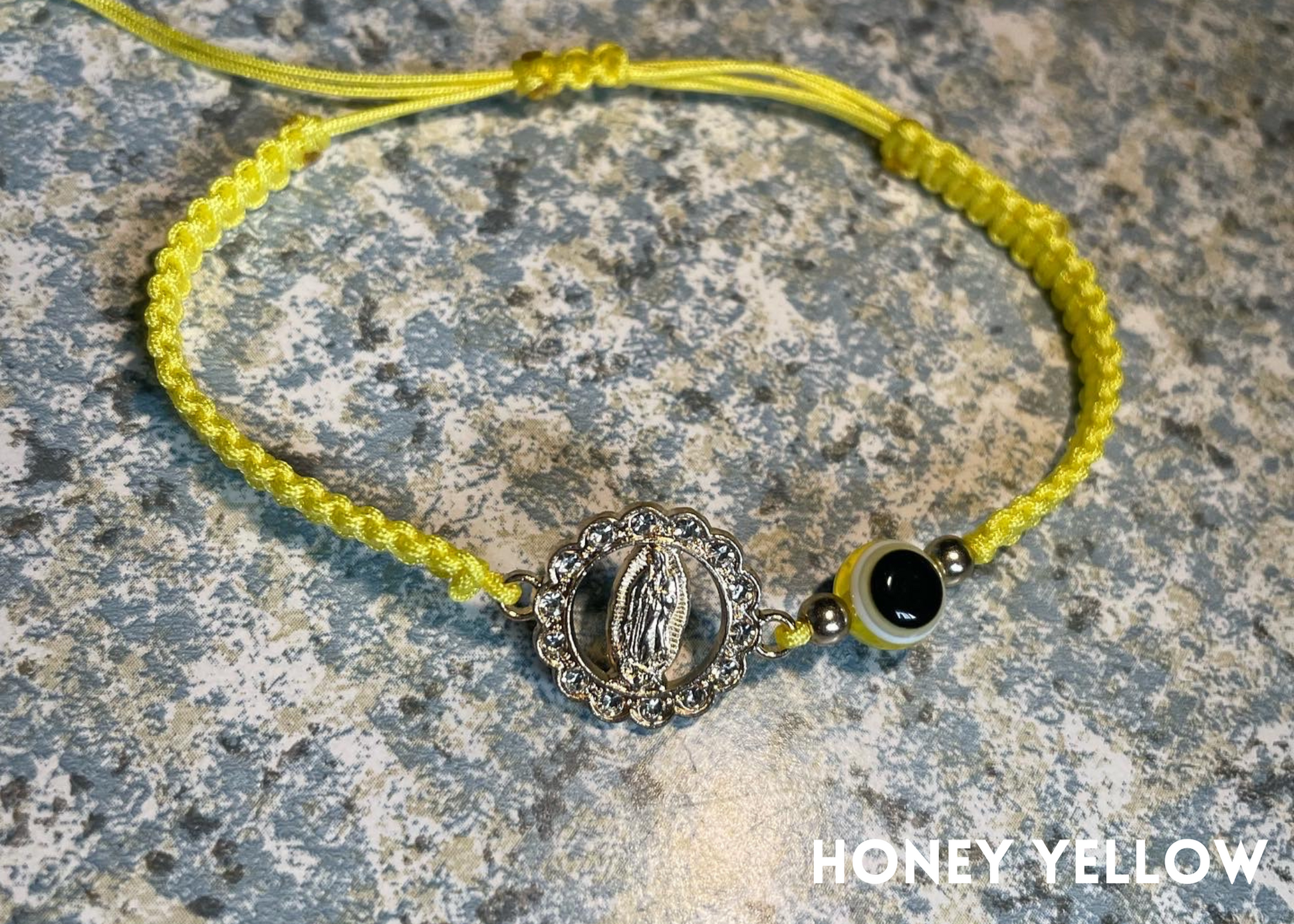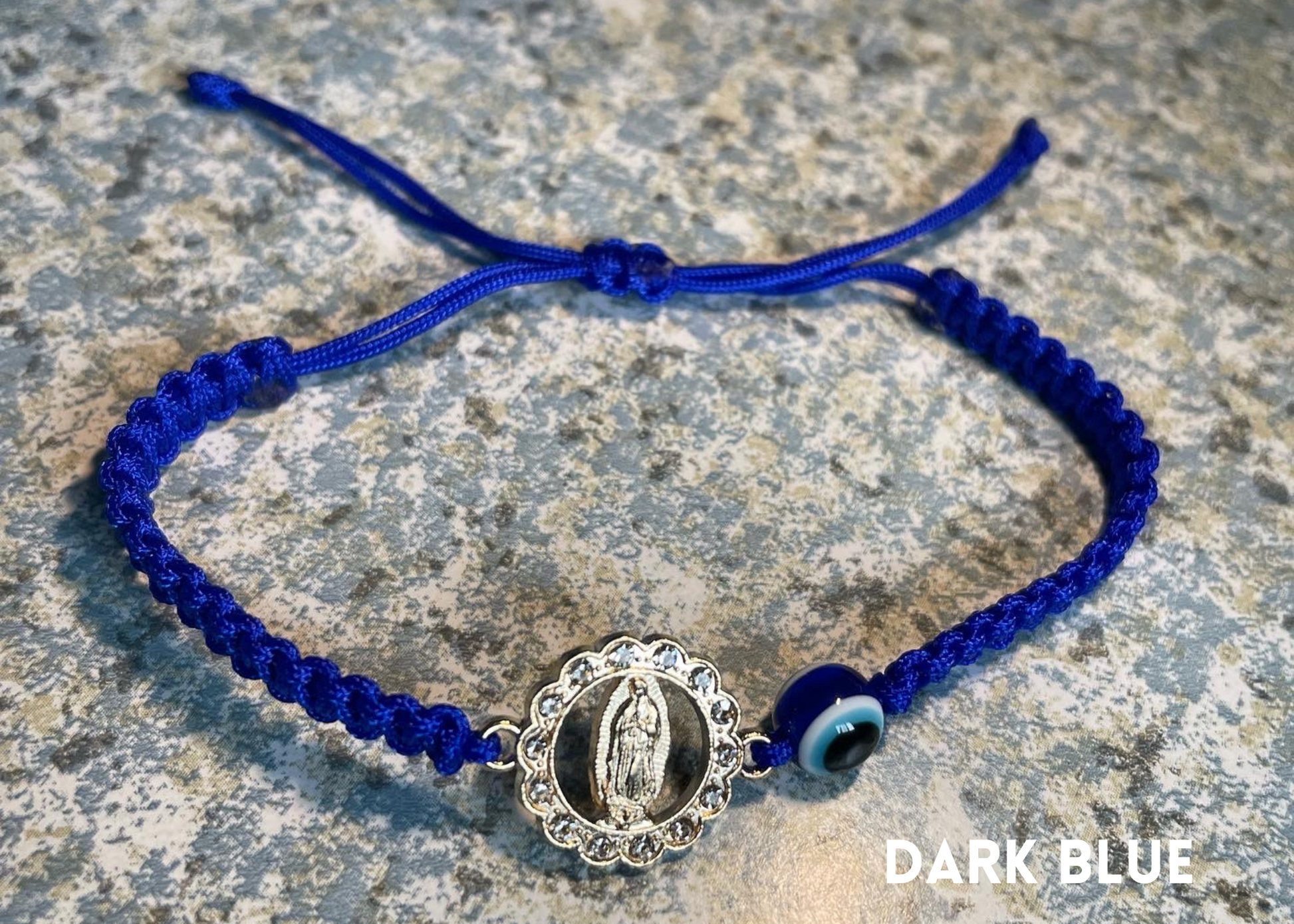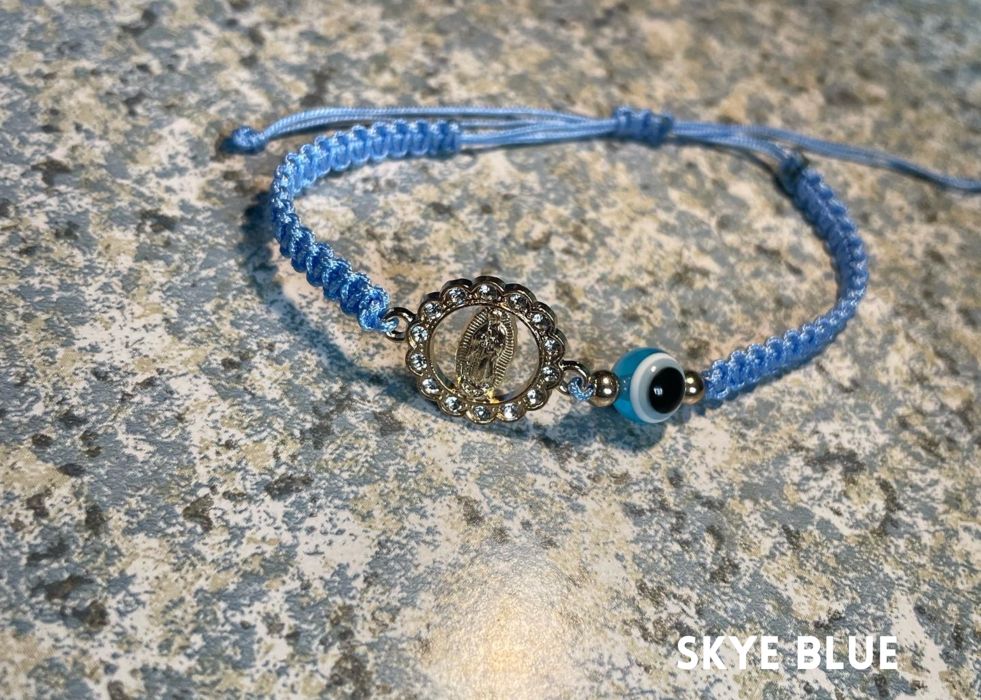 Hand made Virgin Mary bracelet with evil eye. Self adjustable for any size, and cleansed upon arrival.